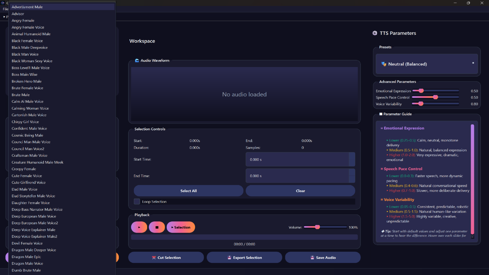 Character Voice Maker Studio represents a new approach to text-to-speech synthesis. Rather than relying solely on neural networks or concatenative methods, our Audio Interpolation Algorithm provides a balanced solution that offers both quality and control.