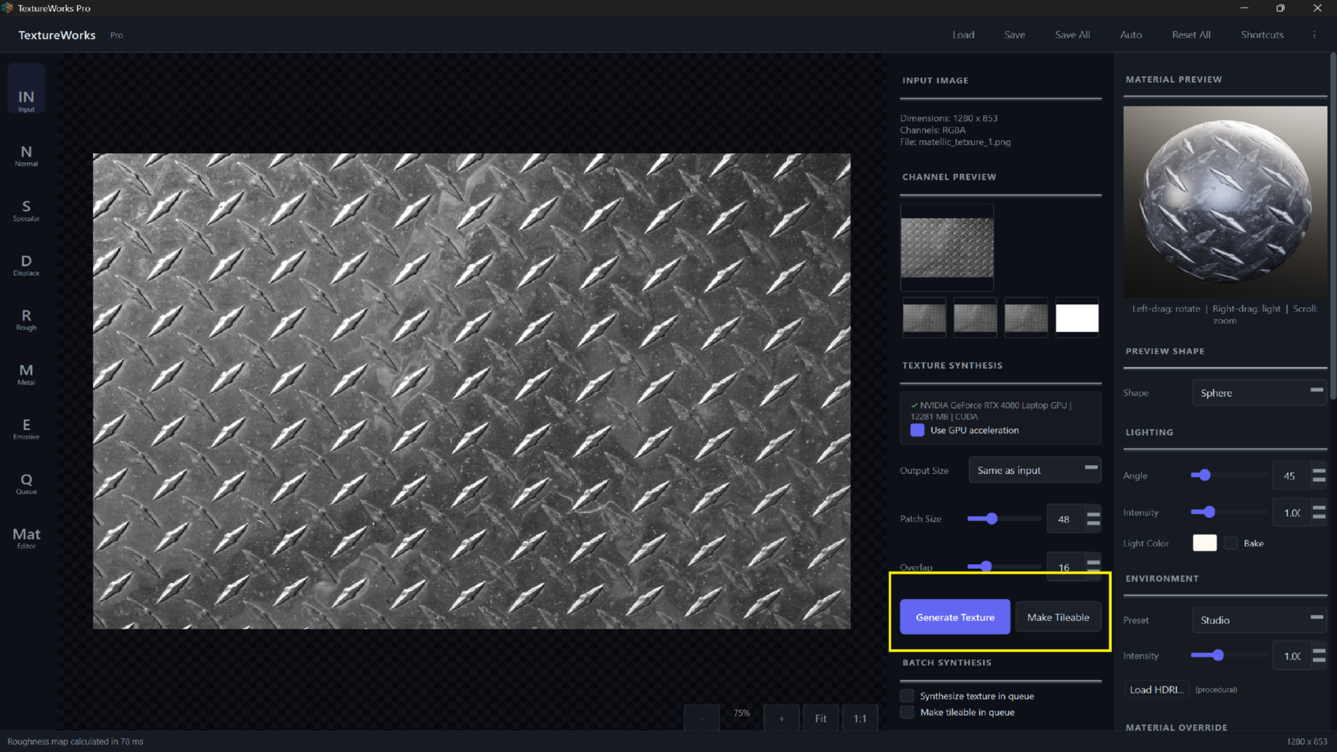 TextureWorks automatically detects your GPU and selects the fastest compute path available. NVIDIA CUDA delivers the biggest speedups, with intelligent fallback to CPU when needed. Texture synthesis, map generation, and material rendering all benefit from hardware acceleration.